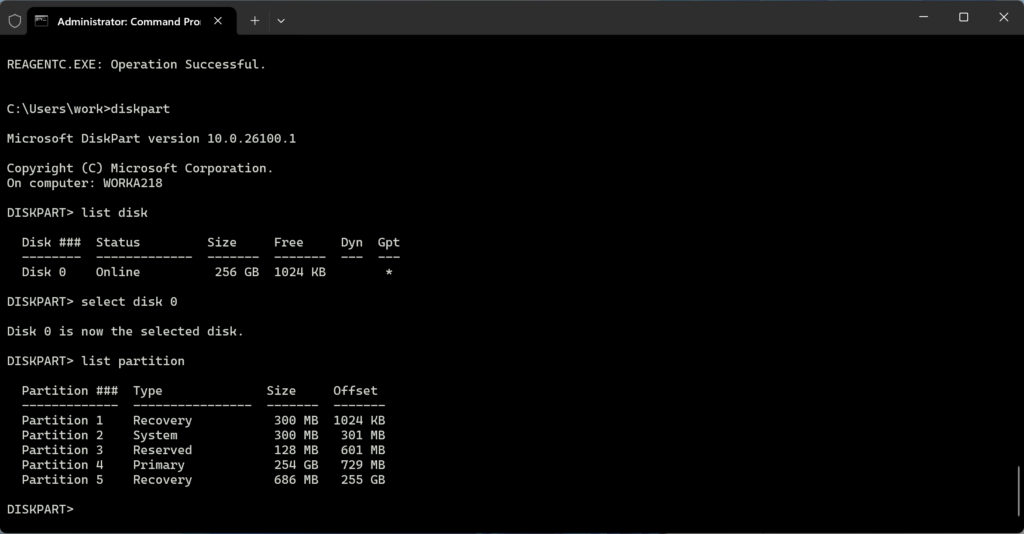 and that partition 5 matches the 686MB one I need to delete. - Disable the Windows recovery agent:
